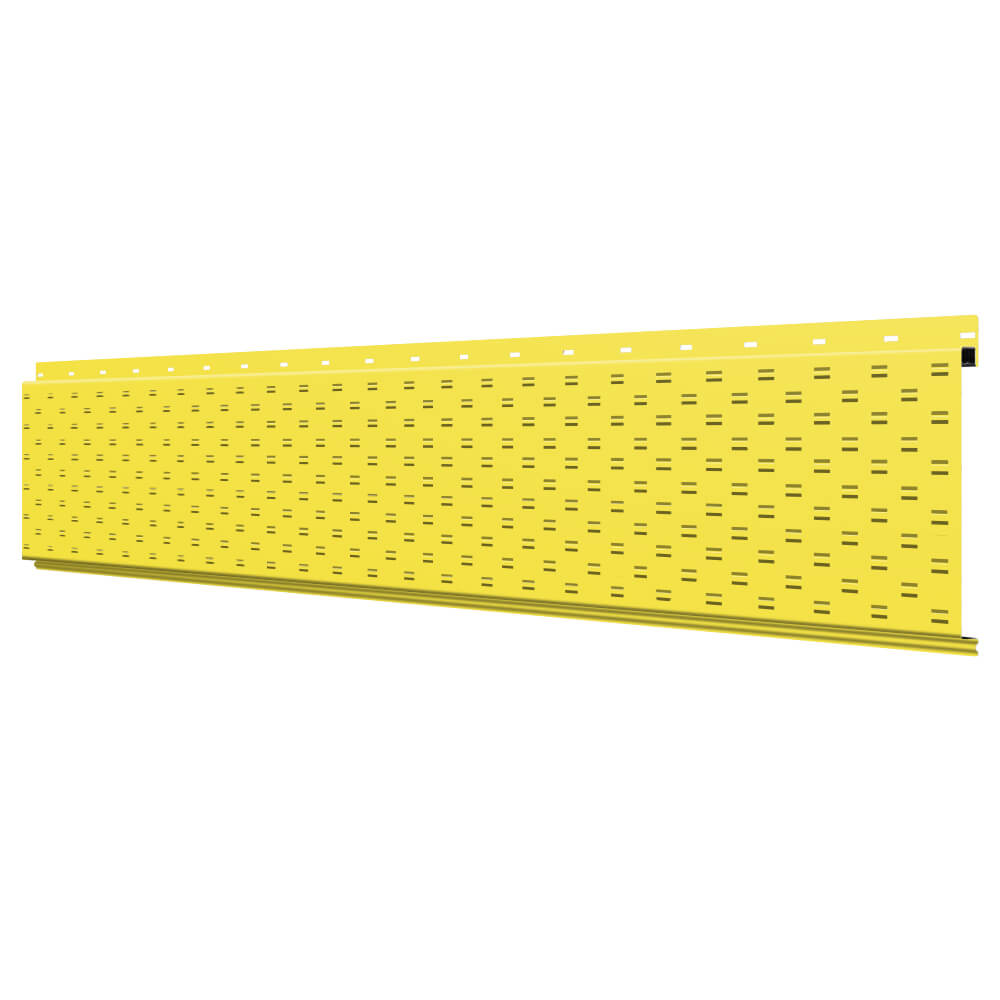 Линеарная потолочно-стеновая панель с ПЕРФОРАЦИЕЙ для вентиляции цвет RAL1018 Желтый применяется в качестве софитов для подшивы крыши, наружной и внутренней отделки потолков, стен, фронтонов фасада дома в Элисте.