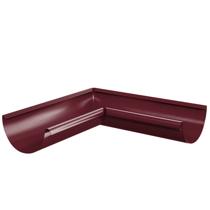 Угол желоба водостока внутренний 90 градусов d125мм RAL 3005 Красное Вино металлический - используется для надежного сопряжения двух желобов между собой на внутренних углах 90 градусов карниза кровли. Угол желоба изготовлен без сварных сопряжений, методом прессования (глубокая вытяжка), что придает ему дополнительную коррозийную и механическую стойкость.